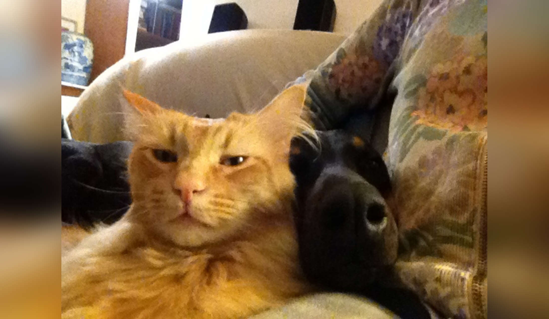 My main photo here shows one such scene. I am seated with my beloved housemate (and dog-whisperer), a rescued Norwegian Forest Cat named Tomas Coeur de Lion. Tomas tamed our previously cat-averse Dobermann neighbor. The dog would not want to get off the couch to go home when they came to collect her!