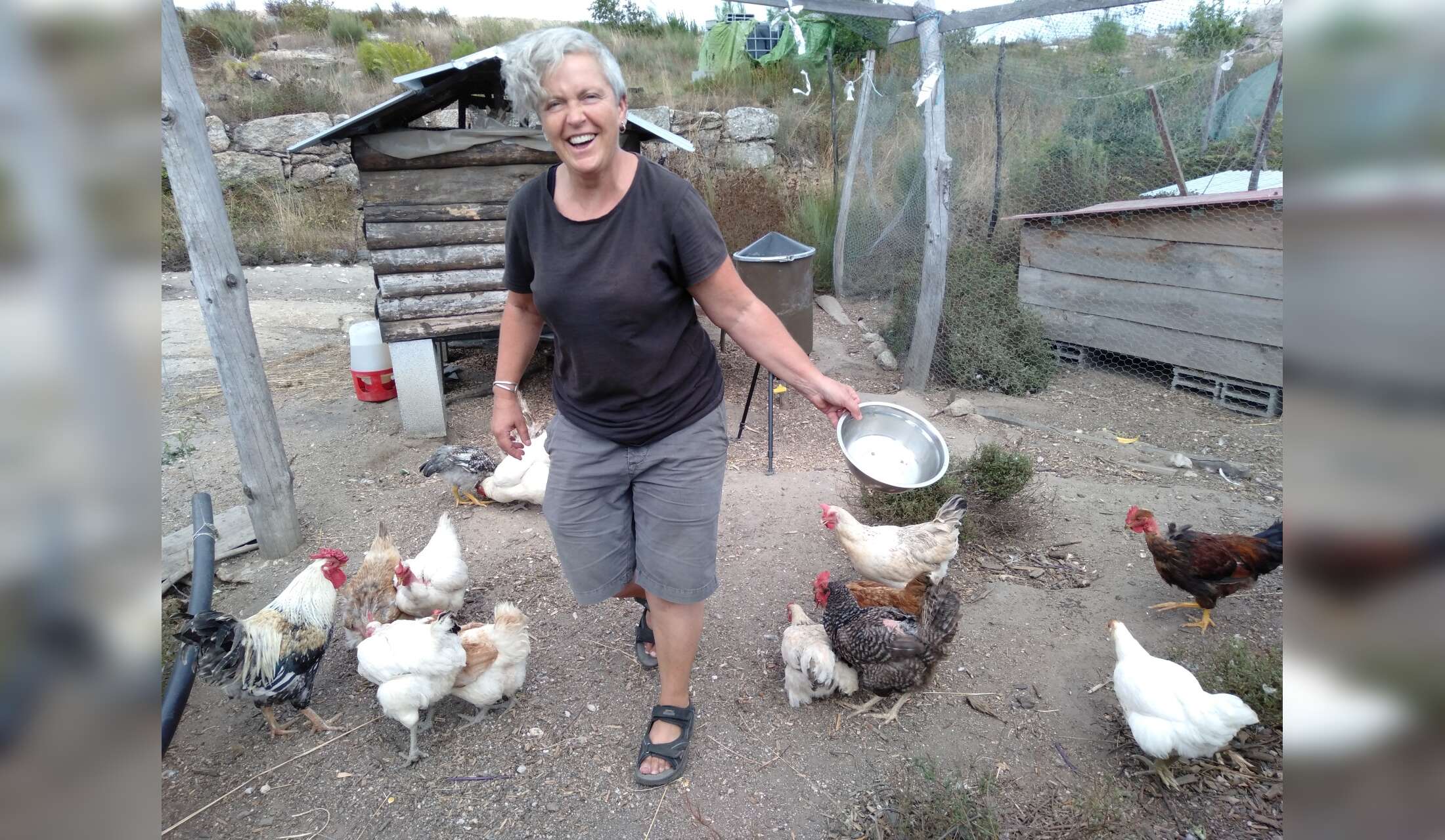 • a small farm in Central Portugal with 2 dogs, 3 cats, 25 hens & a rooster