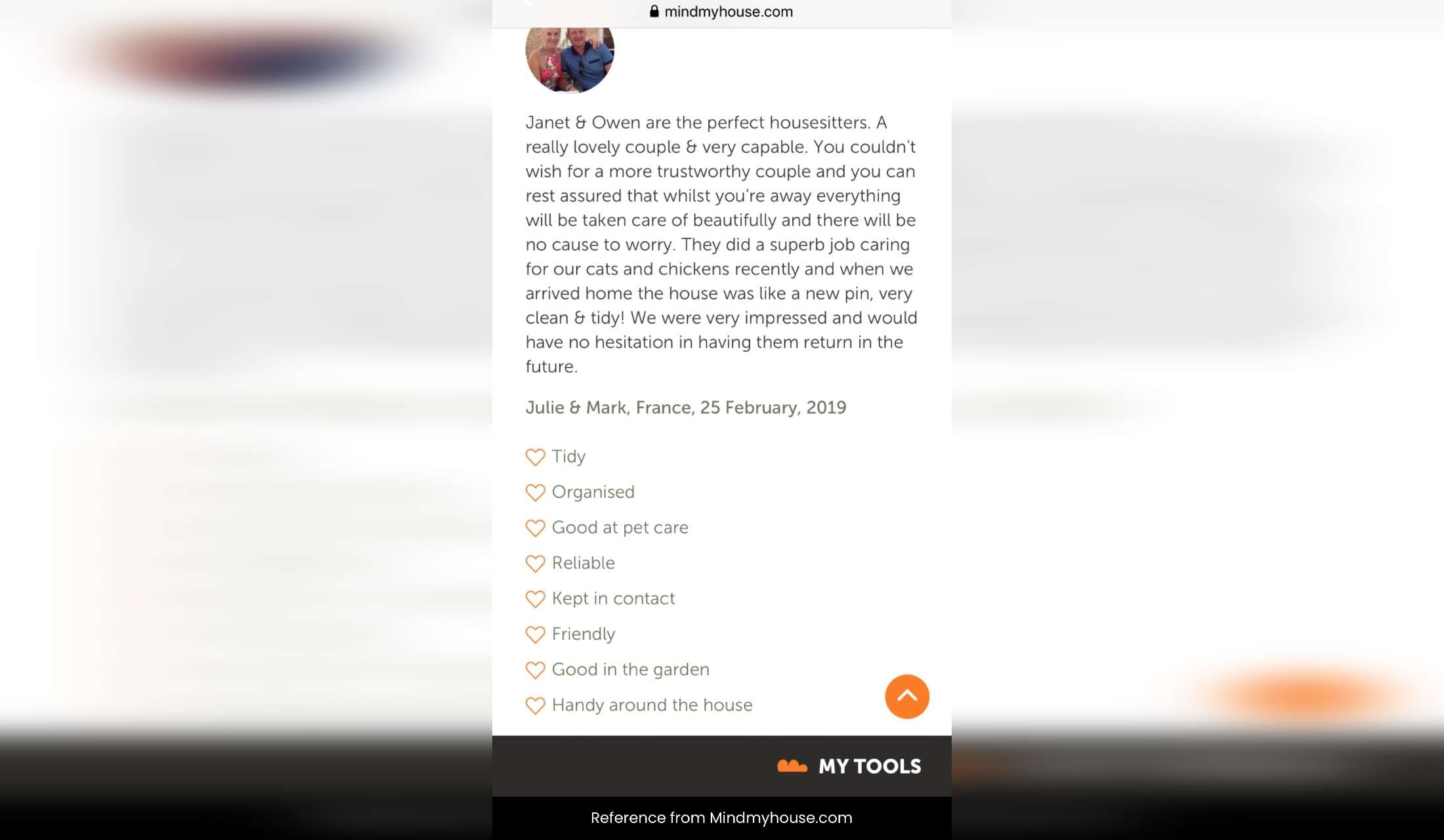 Janet and Owen came to us at short notice for just a weekend. Our first use of sitters. They were brilliant and obviously completely used to coping with anything. We went away confident that they would look after our little house and the animals. We came back to find they had even done the laundry which was much appreciated. Can not recommend them too highly.