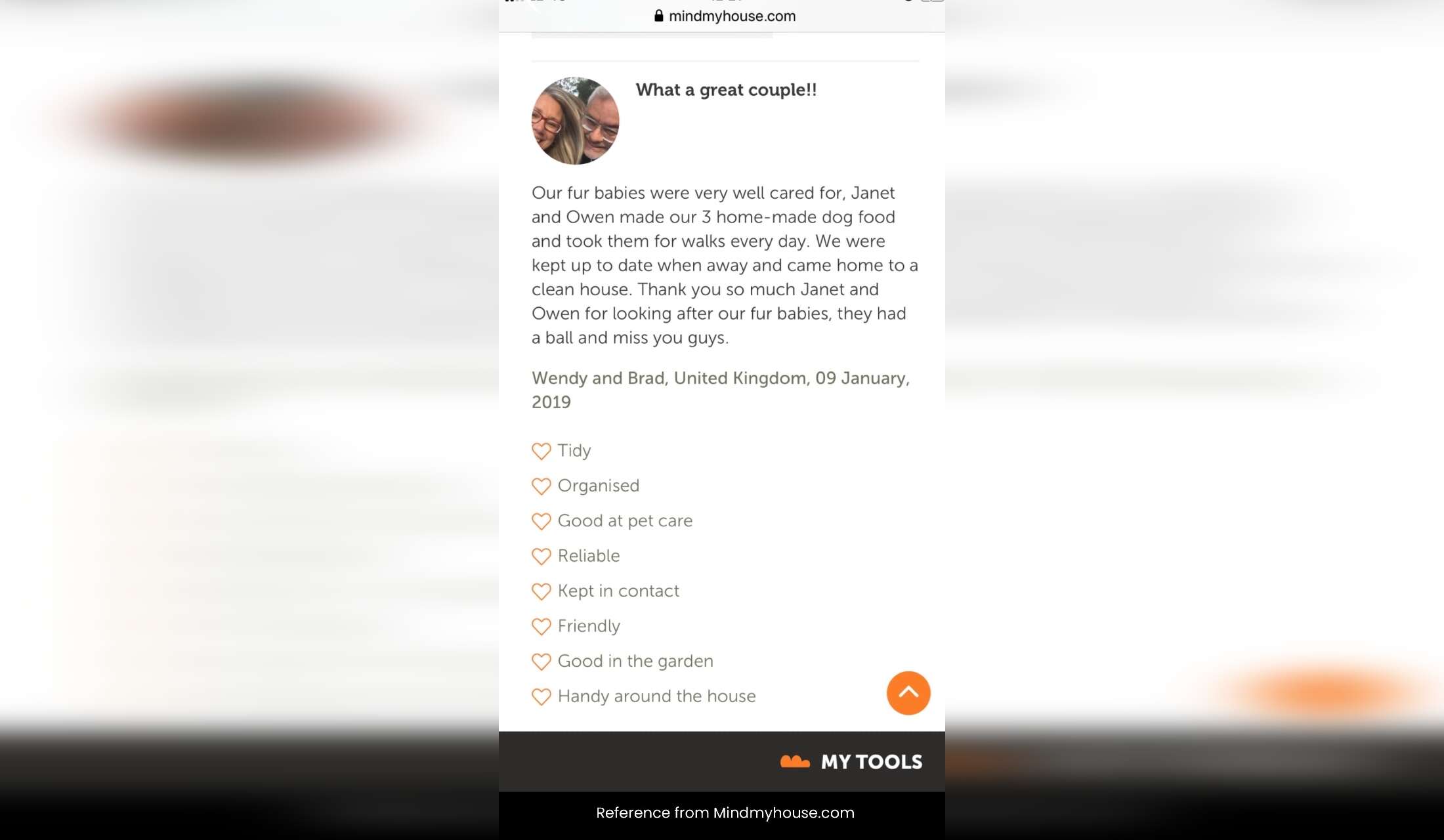 Janet and Owen are a lovely couple and I felt very comfortable leaving my pets with them. They arrived with all their provisions. Kept our home tidy and did some extra tidying too. They also kept me up to date with my kitties and how they were. All laundry and beds stripped when we got home all in the wash. I even got my washing I had left tidied and folded too! Thank you. I wouldn't hesitate to recommend or have them pet sit again (hint hint).
