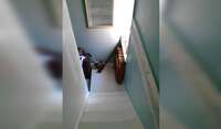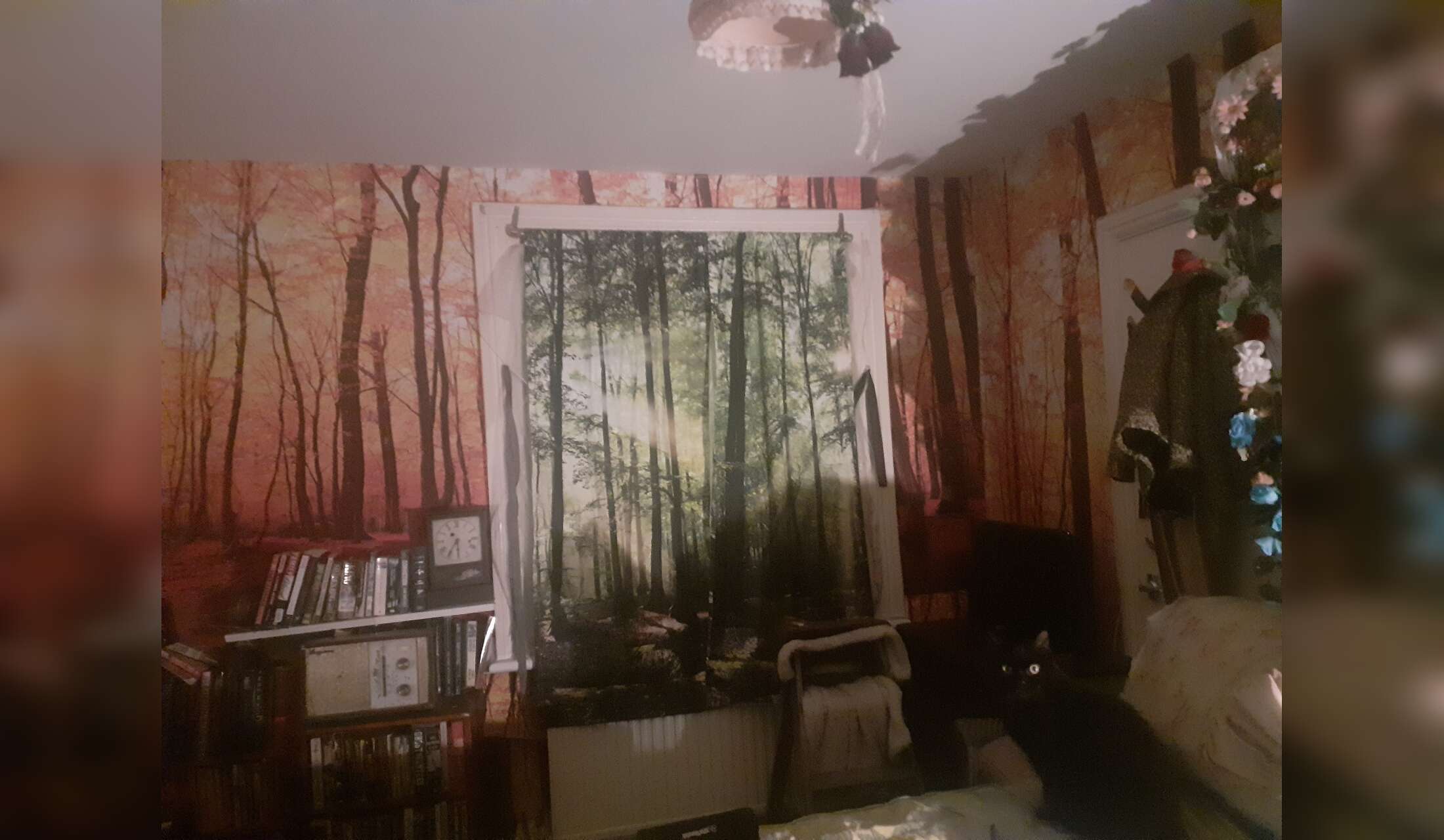My flat is on three floors, so stairs. It's a bit boho, I have lots of vintage items and do a lot of DIY. Cat has her own bathroom! Everything tends to be about Ninevah-cat, so she can perch and get around etc. She spends most of her days in the bedroom , sleeping and sometimes watching her little TV. She sleeps with me on the bed, of course, but has little beds and perching areas everywhere. She's a very mellow cat! Her vet is down the road.