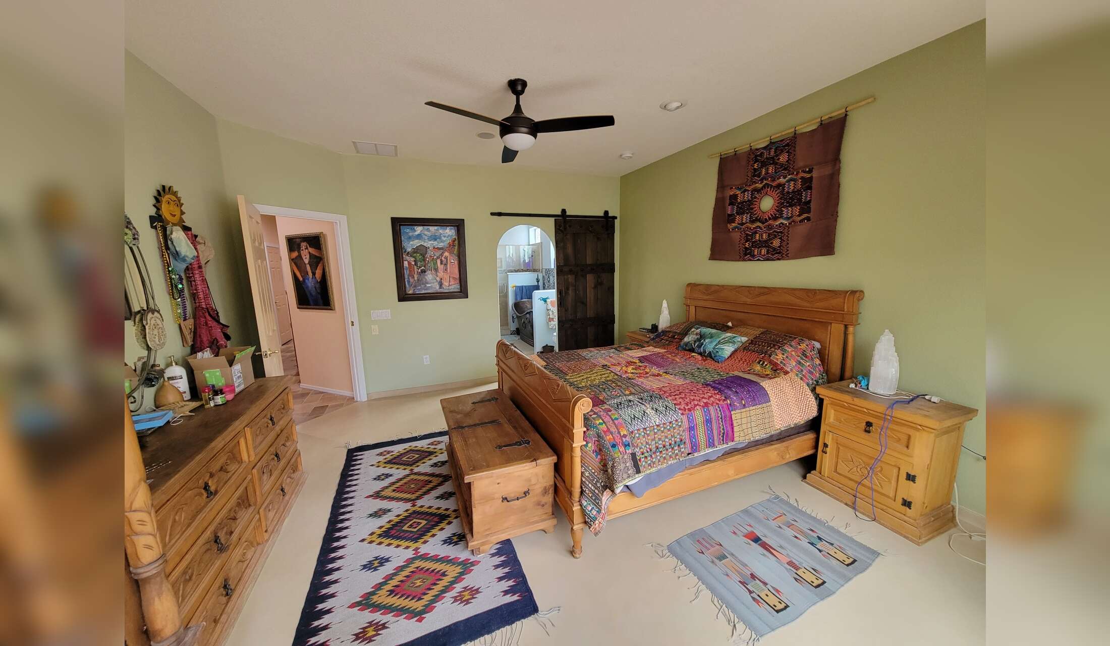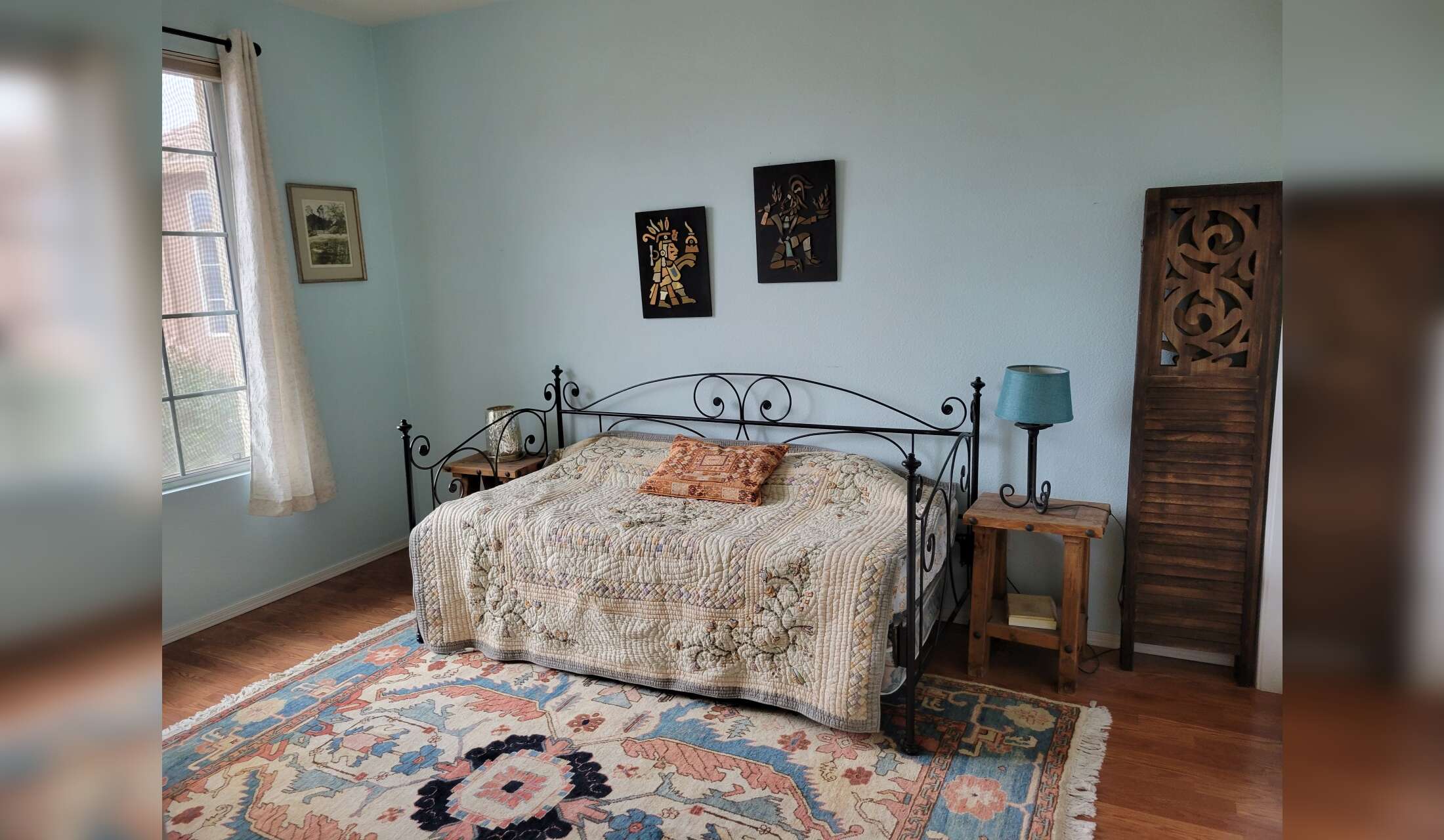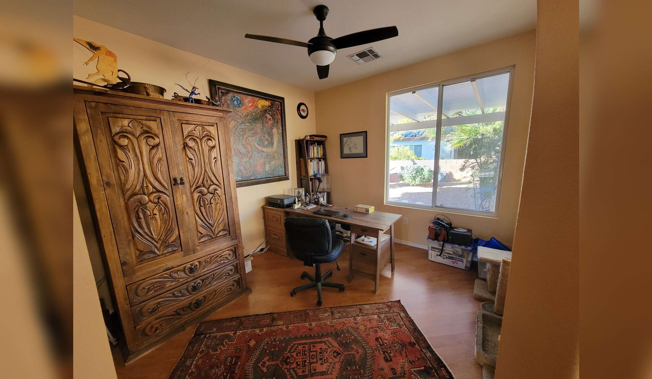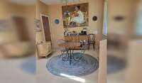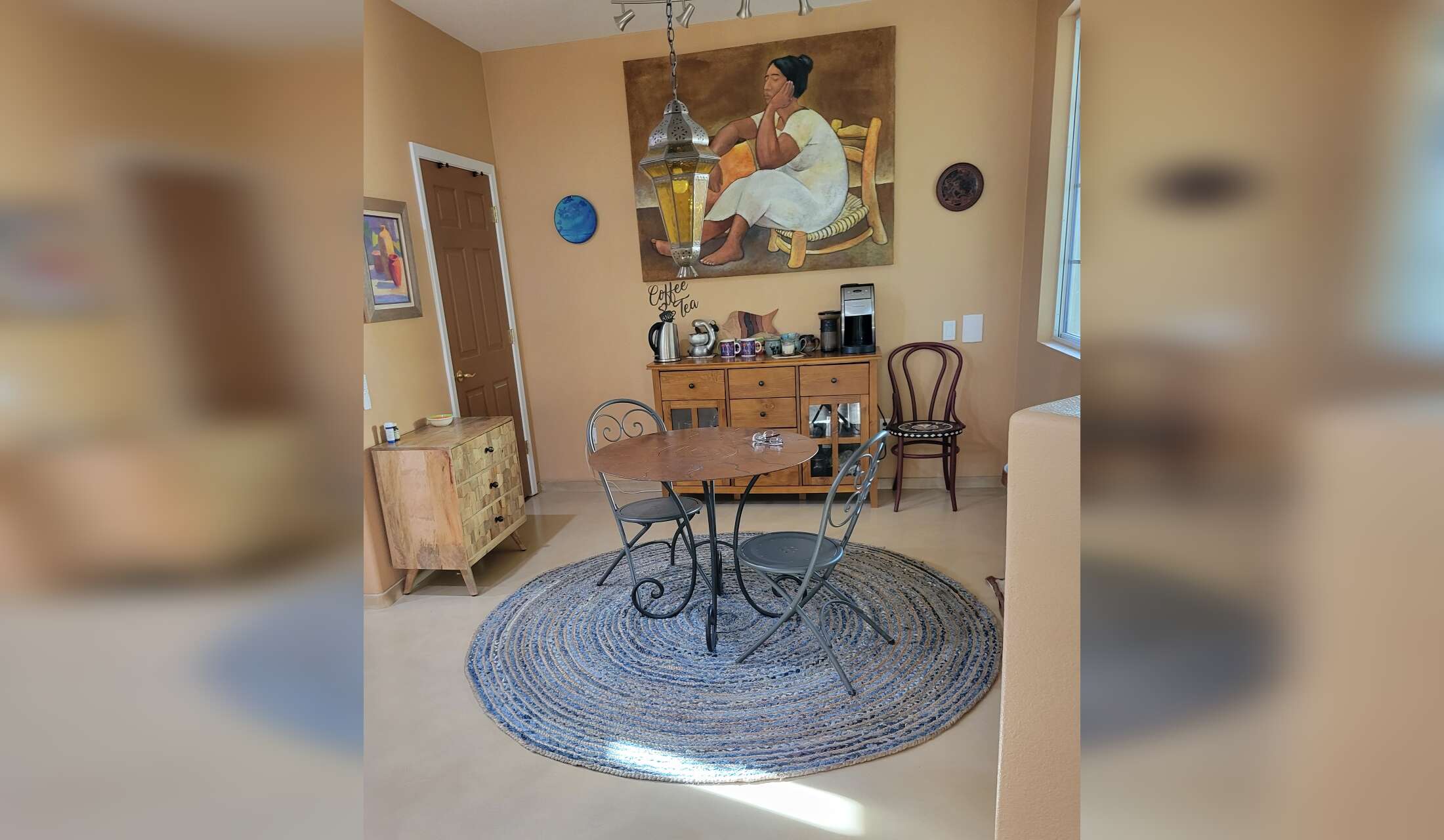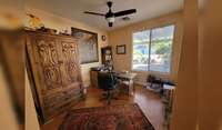 Our house is 2 bedroom, 2 bath, with an office and open kitchen-living-dining areas. We also have a breakfast nook with coffee bar, a cozy front patio, and a large back patio surrounded by a lush garden. Large windows let in lots of the outdoors, with garden views and some views of Sombrero Peak, distant mountain ranges, and the saguaro-covered nearby hills. There is a 2-car garage and laundry room.