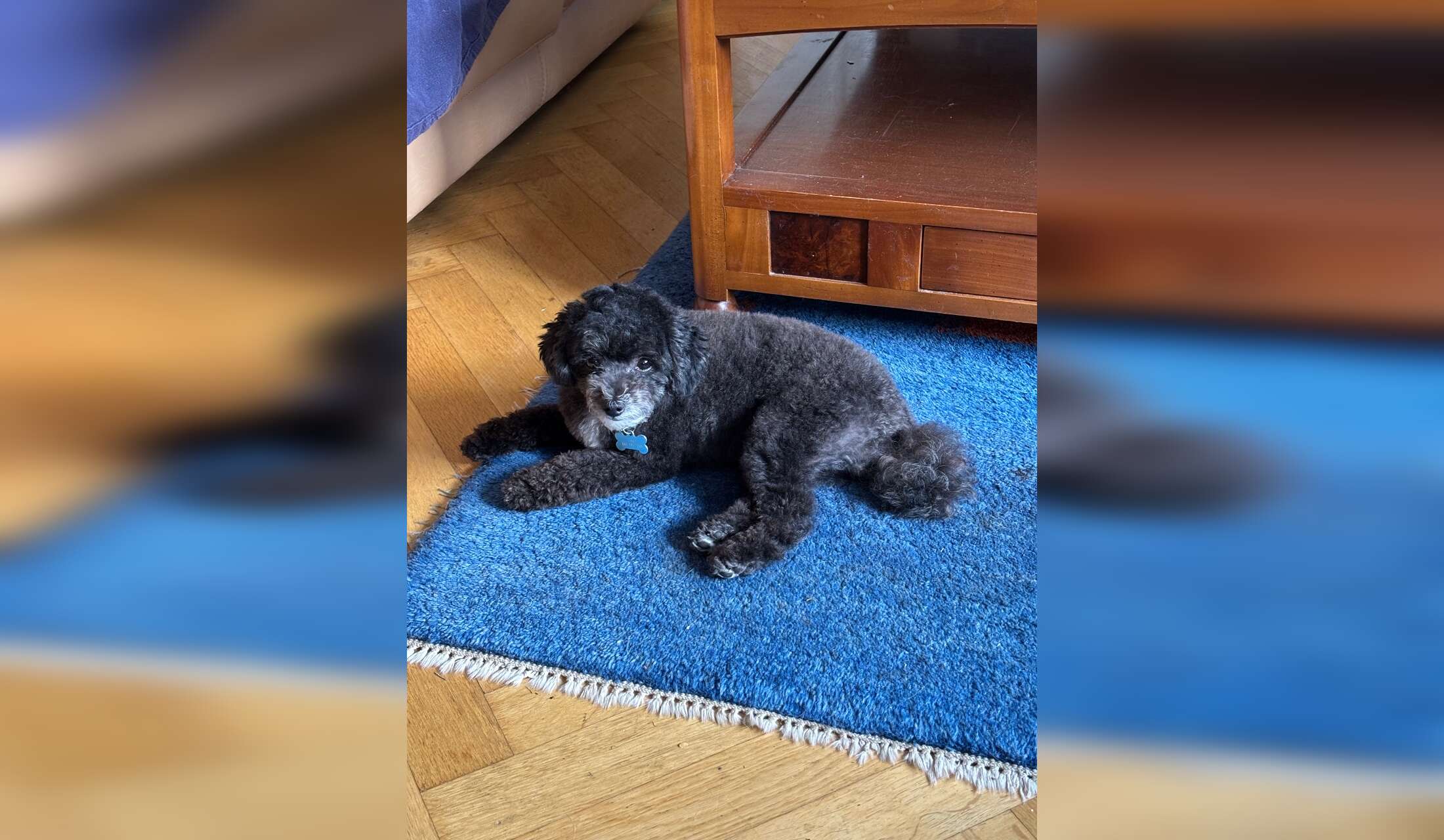 An elder lady and a young toy poodle who sleep in bed with me