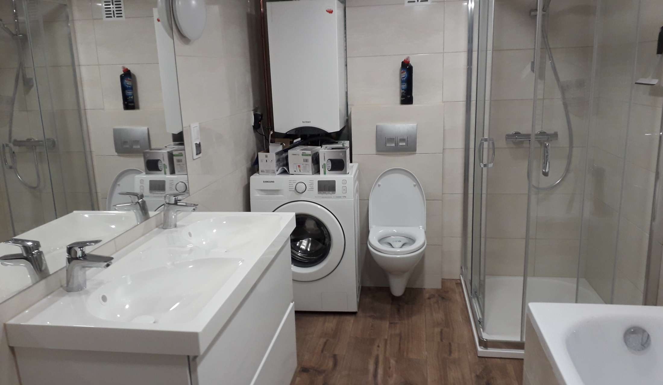 Place for a car in house area is available but without roof. To the closest shop (Lidl) there is 1,5km. in 3 km distance (e.g. by tram) there is small centre with palace and restaurants and shops.