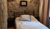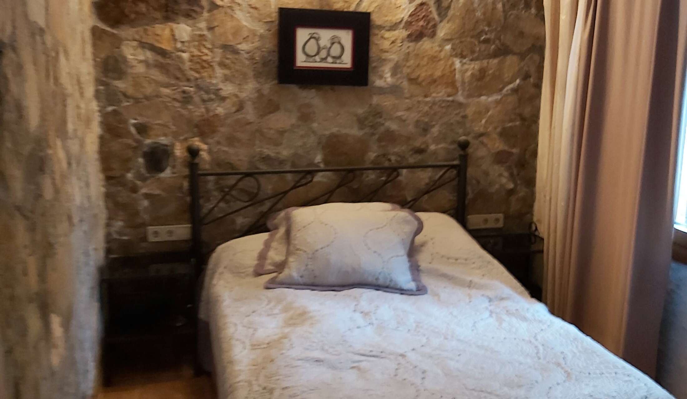 It is very quiet and in the middle of the countryside but not isolated. It is also very close to the little village, 500m .There are big towns and the beach within 30 or 40 minutes.15km to the next bigger town and hospital. 20min with the car. 15km also to the french border. 30km to the beach. 60km to the next airport in Gerona or Perpignan. The land measures 6000m2 and has mostly olive trees. Beautiful views and surroundings.Loads of walks and bike tracks.There is a lovely wood burning stove in the living room, confortable sofas and beds and a well appointed kitchen for those who like to cook.Plenty of fresh eggs. Satellite tv and wifi.You would be in the guest room, which has a conforted regular sized doublebed and the bathroom is just across the hall.