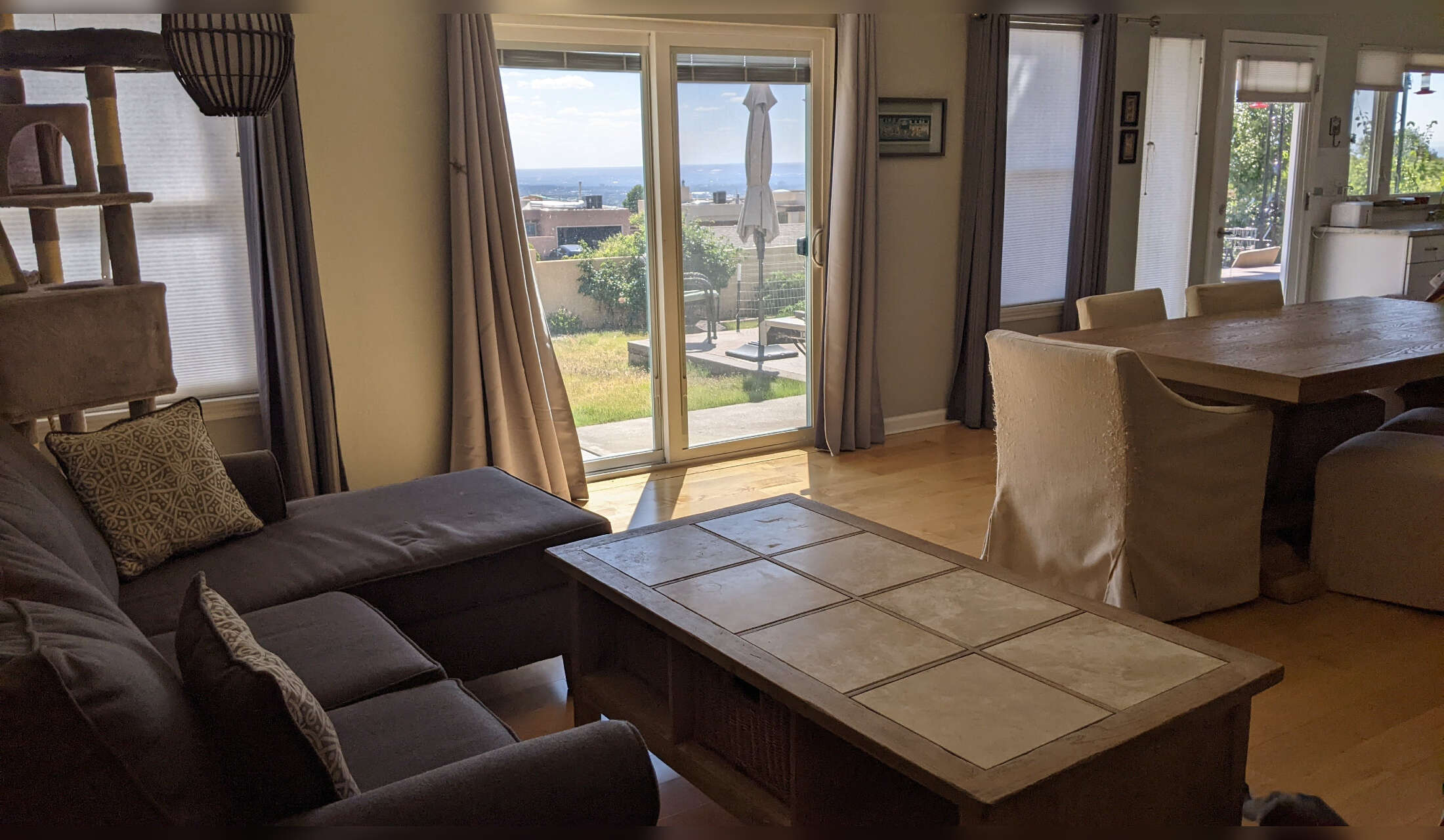 3 bedroom home, 2 car garage, outdoor ambiance lighting, amazing view of the city from backyard, kitchen and living room, view of the Sandia Mountains out front living room, 3 minute drive to hiking trails in the foothills, 3 minute walk from walking/biking path along Tramway Blvd, quiet and safe neighborhood, big backyard with patio for BBQ and firepit, skydeck on roof of house for 360 degree views, 1 minute from Walgreens/CVS, 5 minutes from 5 different grocery stores, 10 minutes to nearest hospital, central location in New Mexico to explore the state! Albuquerque has two Trader Joe's and Whole Foods, as well as an extensive number of international cuisine restaurants. New Mexico gets 310 days of sunshine a year. Lots of interesting outdoor hiking, mountain biking, rockclimbing, and kayaking opportunities. New Mexico is also very diverse and has a lot of unique cultural and scenic attractions, restaurants and diverse neighborhoods.