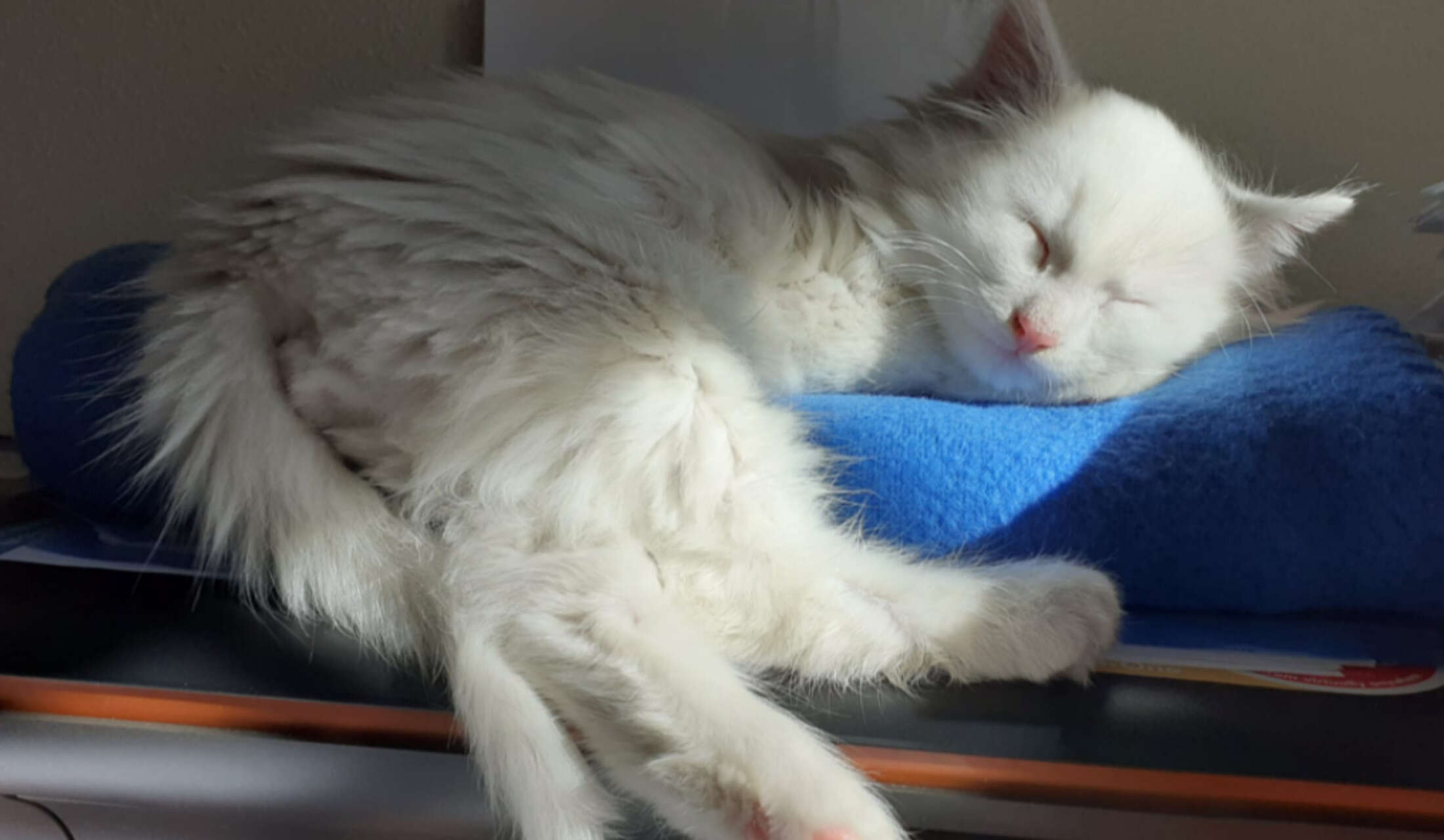 Mainly give affection to our cat and give him company, feed him twice, and clean his toilet daily. He is an easy cat.He was born deaf (as many other white cats) but it is not a problem or take any medication. Simply don't expect he will go to you if you call him, and sometimes he can meows loudly because he doesnt hear himself, that's all. But he is a completely normal and happy cat. Of course he is strictily an indoor cat. You cannot let him out!