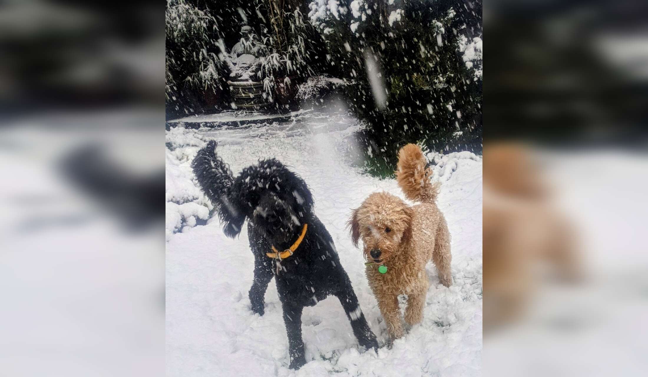 They are both easy to please dogs who like a lot of human contact. Expect them to sit (or lie) by / on you at every opportunity. They have the run of our house and no place is out of bounds. As poodle mixes (Golden Retriever and Poodle) , they do not shed hair.