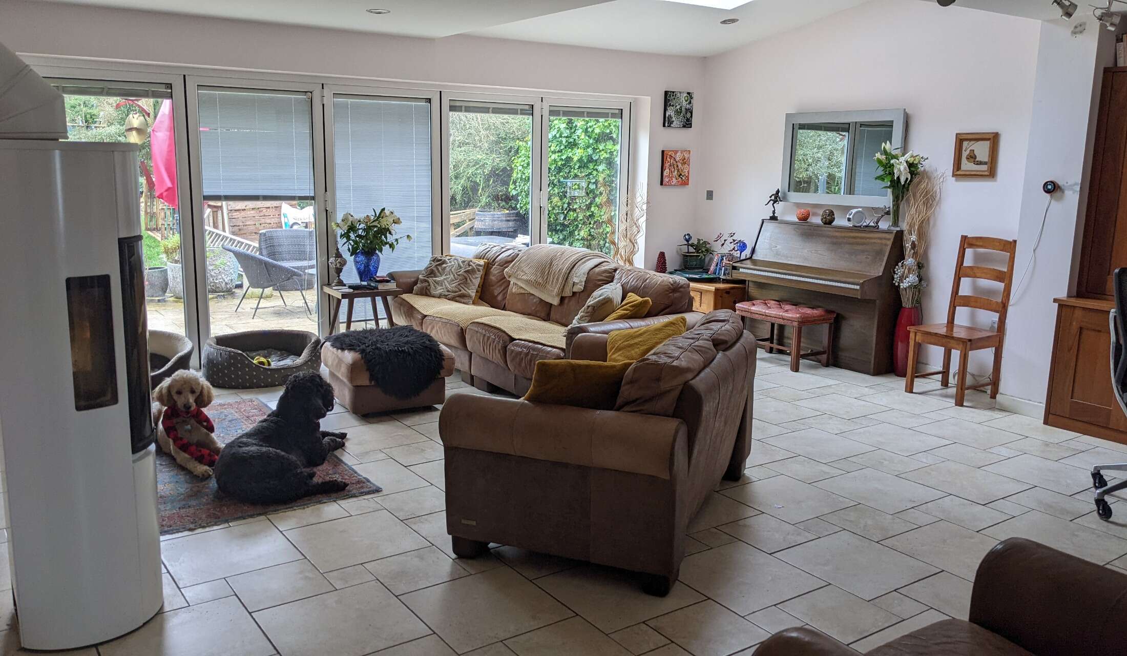 The sitting room and dining room lead through full wall bi-fold doors to a large patio with newly laid ceramic slabs. To one side is a hot tub which is sadly out of use. Blame Vladimir.