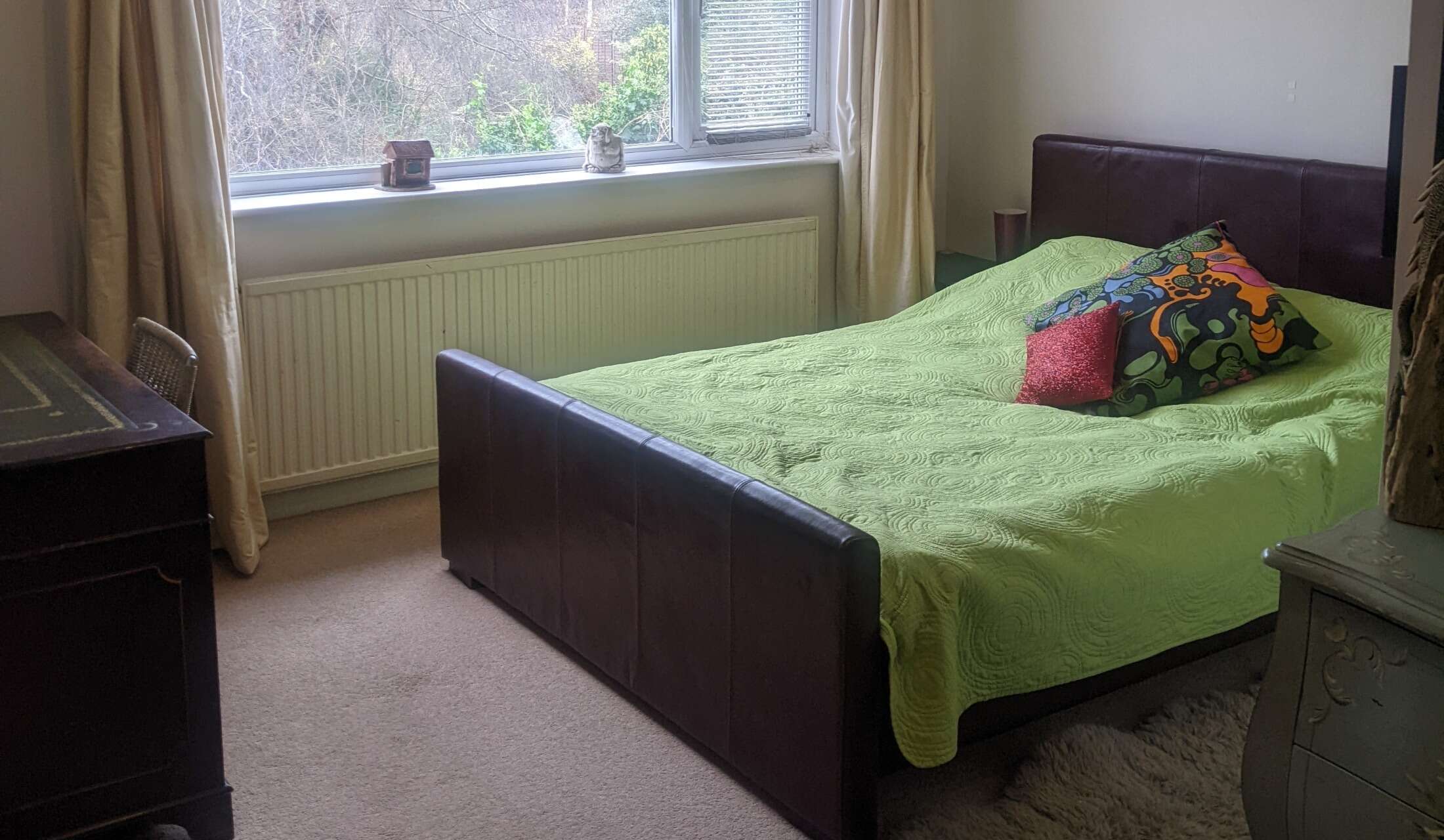 Upstairs we have 4 bedrooms. We would invite you to stay in a large double bedroom with an ensuite (bath and shower). Lenny and Dougal are used to sleeping in whatever bed they choose! You would have thought this was their house….