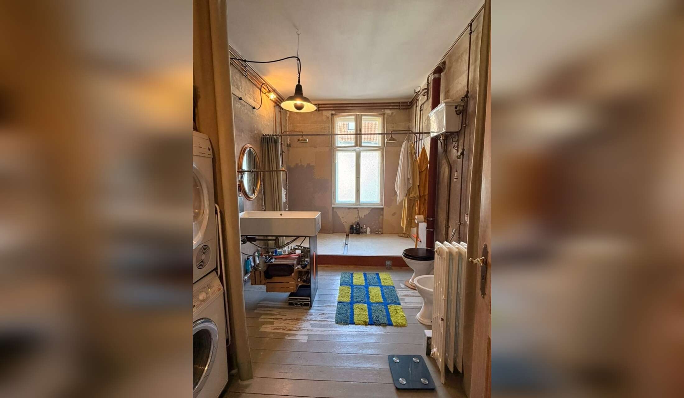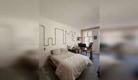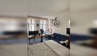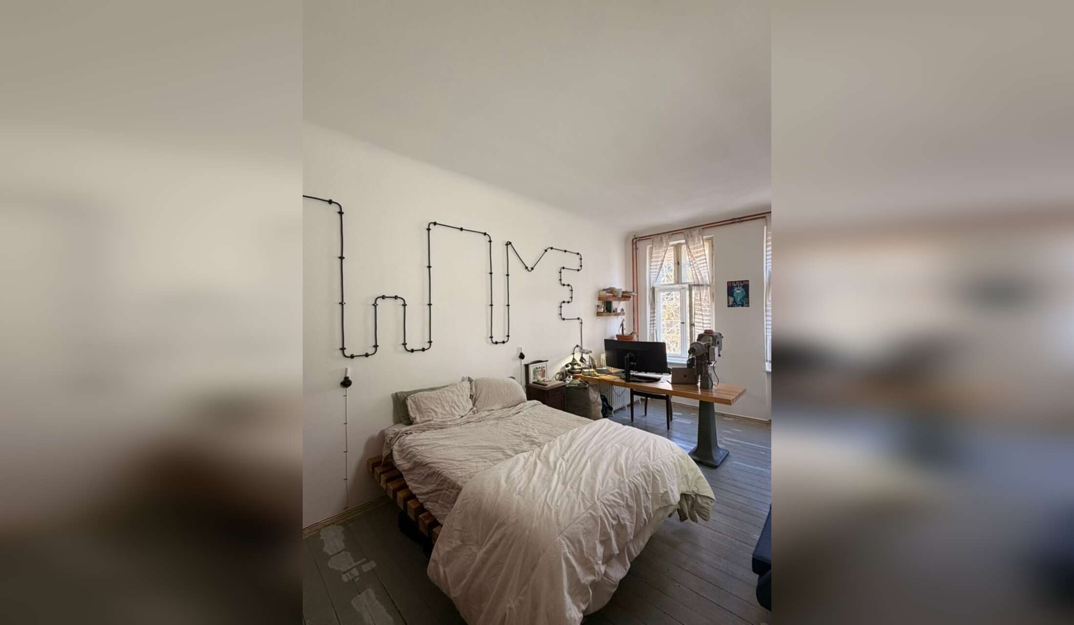 Wifi hovers between 75-100mbps. There is a large office desk in the bedroom that is propped up by an old projecter (see pics). The wide computer screen will be left here and can be used for remote work.