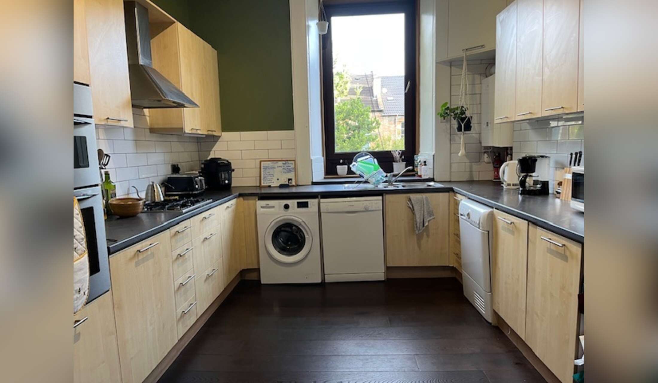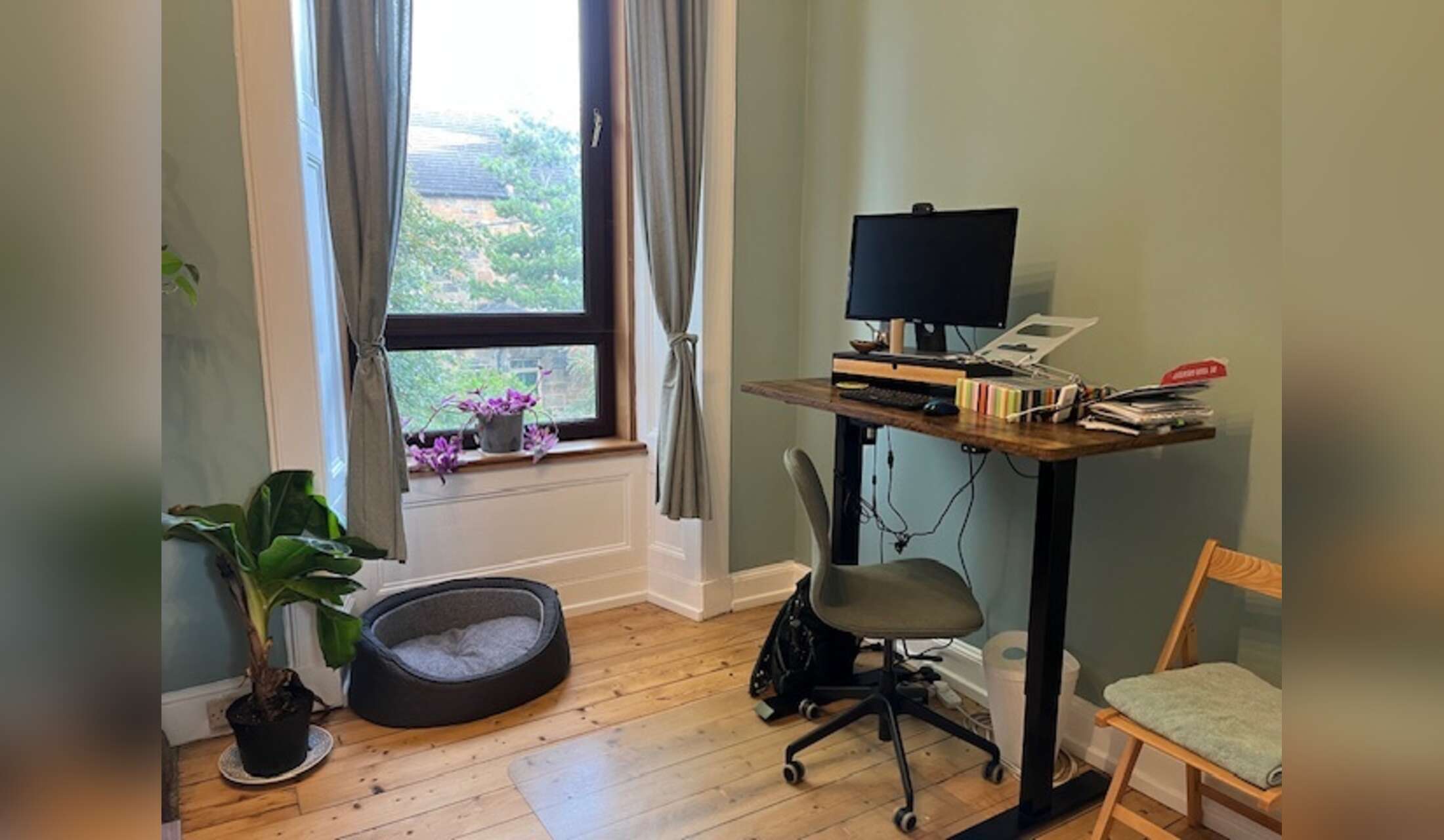 Our flat is on the first floor (one up from the ground floor) of an old, classic, Glasgow tenement building (stone walls, high ceilings). There are 3 bedrooms- two with proper beds, and two with full working set-ups (as we both often work remotely from home). We have 2 bathrooms, a big kitchen, living room and entry hall. We have a big tv & dining table in the living room, a smaller tv in one of the offices, dishwasher, washer, dryer (rare for the UK! Also a pulley to hang dry clothing indoors), fridge & freezer. The back garden is shady and shared :)