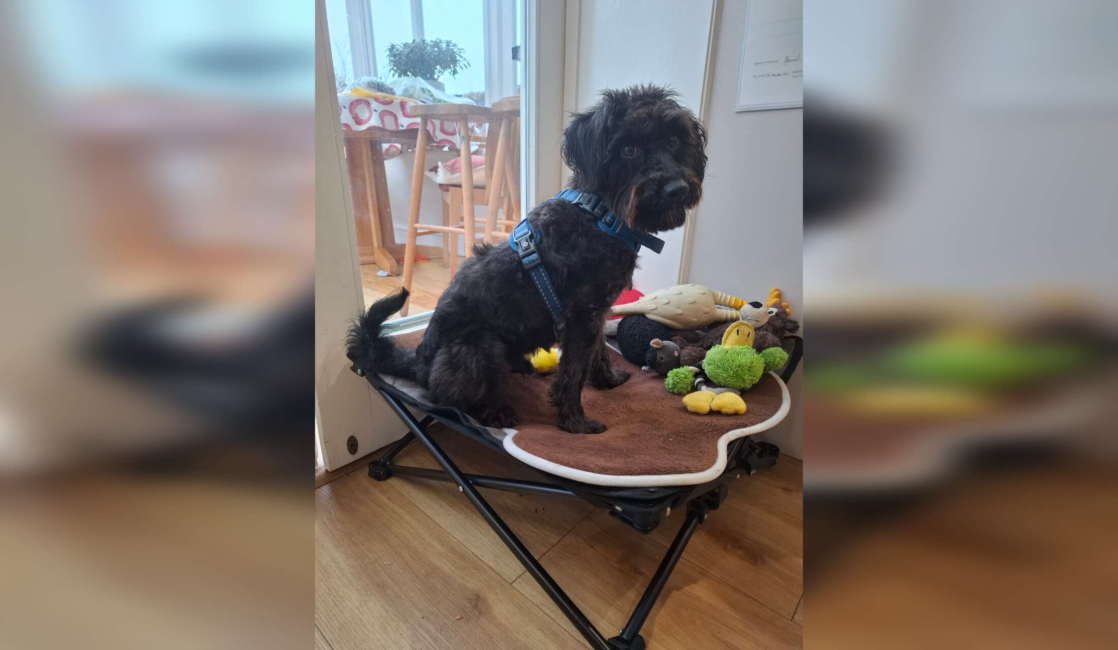 At 2 years old Alfie is now well trained (about to take the Kennel Club Gold Award). He is lovable and engaging although does need plenty of attention and regular walks Usually he and Pushkin get on OK. He is now less boisterous with her than when he was a puppy. Sometimes when she feels harassed she needs prompting to stay in the living area. She enjoys being cuddled.