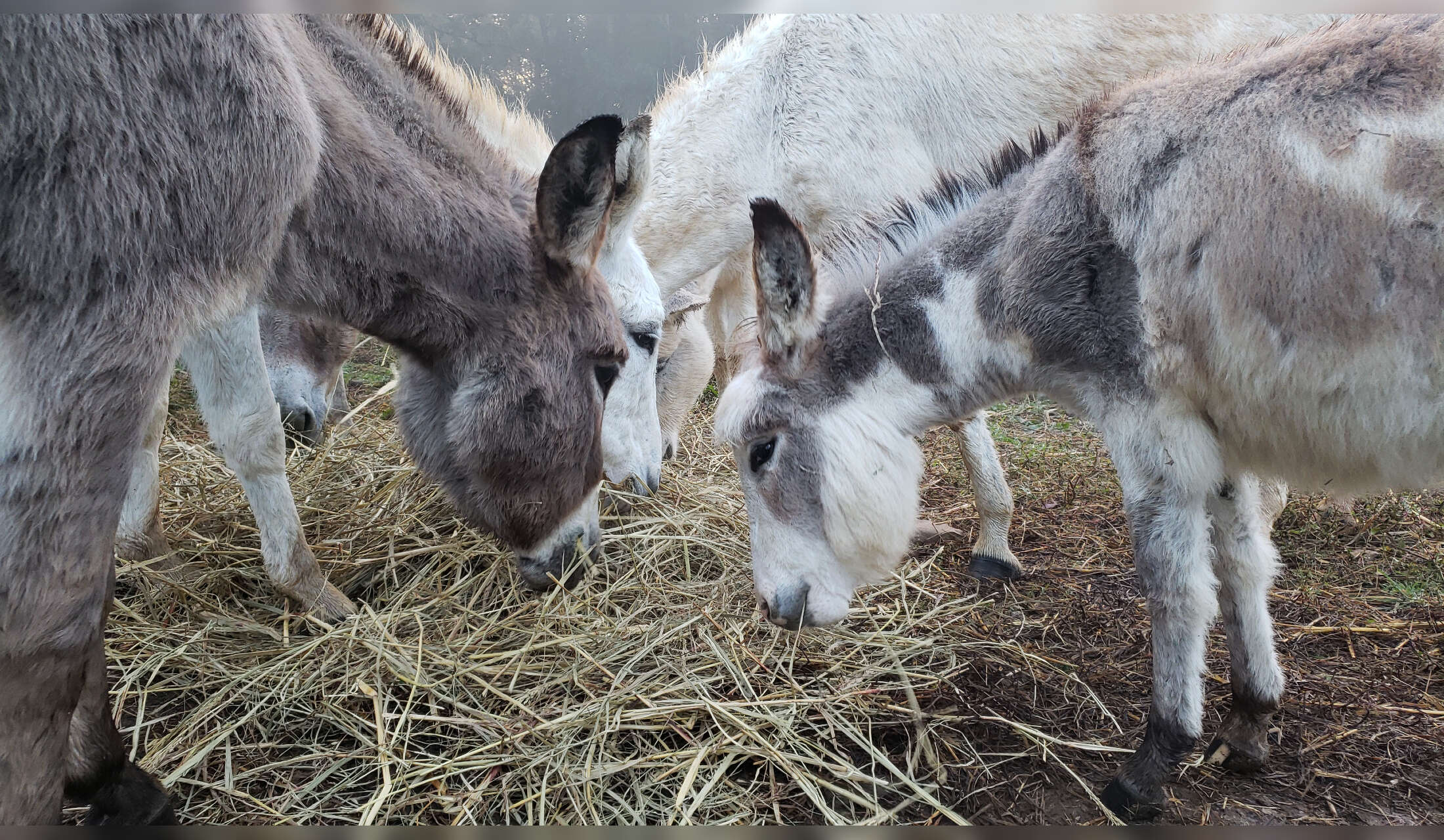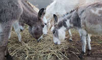 Donkeys. There are 15 total - 2 are standards, 3 are full minature, and the rest are in between. They get fed hay in the morning and night, feed mid-day and one group of the females is allowed to graze for a few hours late morning using the feed routine to bring them back in. (need shoes that can get muddy, long sleeves as hay can be scratchy, and dexterity to open latches to walk through gates holding items as well as making sure the donkeys don't walk right by you.