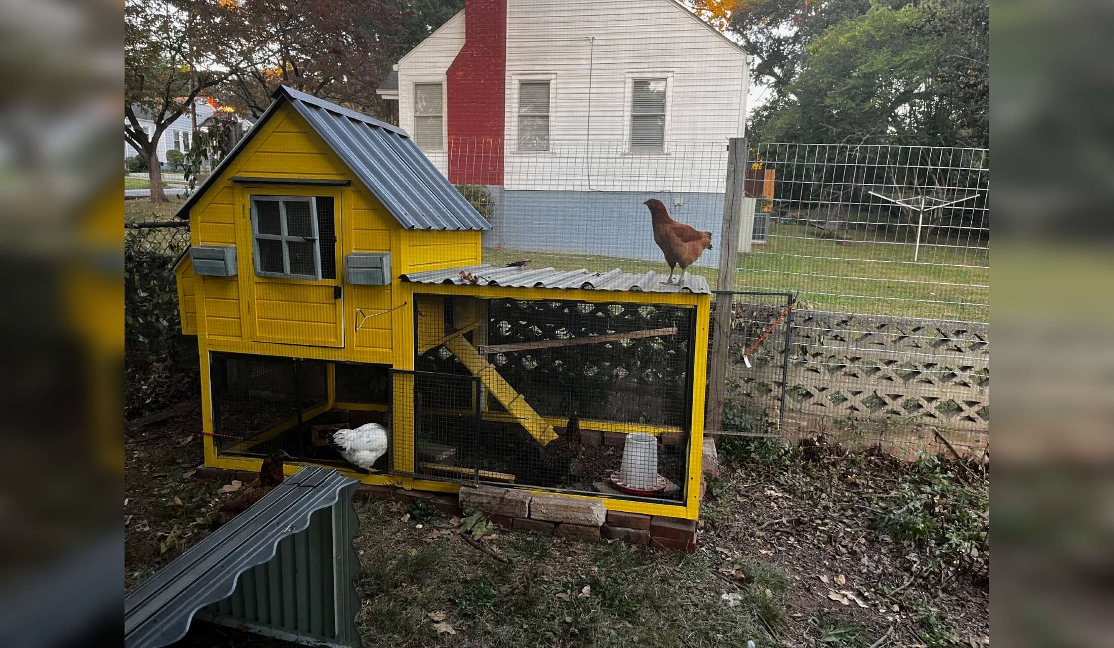 The cat's food and water and the chicken's food and water are all set up in a way that they don't need daily attention. Just check every couple of days and refill as needed. The cat's litter box should be scooped every couple of days too, but since both cats are indoor/outdoor cats they don't use it too often.