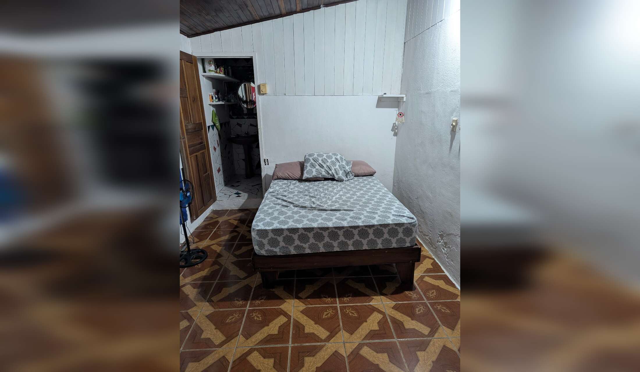 Located in a safe and quiet neighbourhood, this rustic house is fully furnished. There's a ceiling fan above the bed and 2 standing fans.