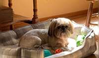 Our small dog is an adopted Shih Tzu, who is 8 years old and easy to take care of.