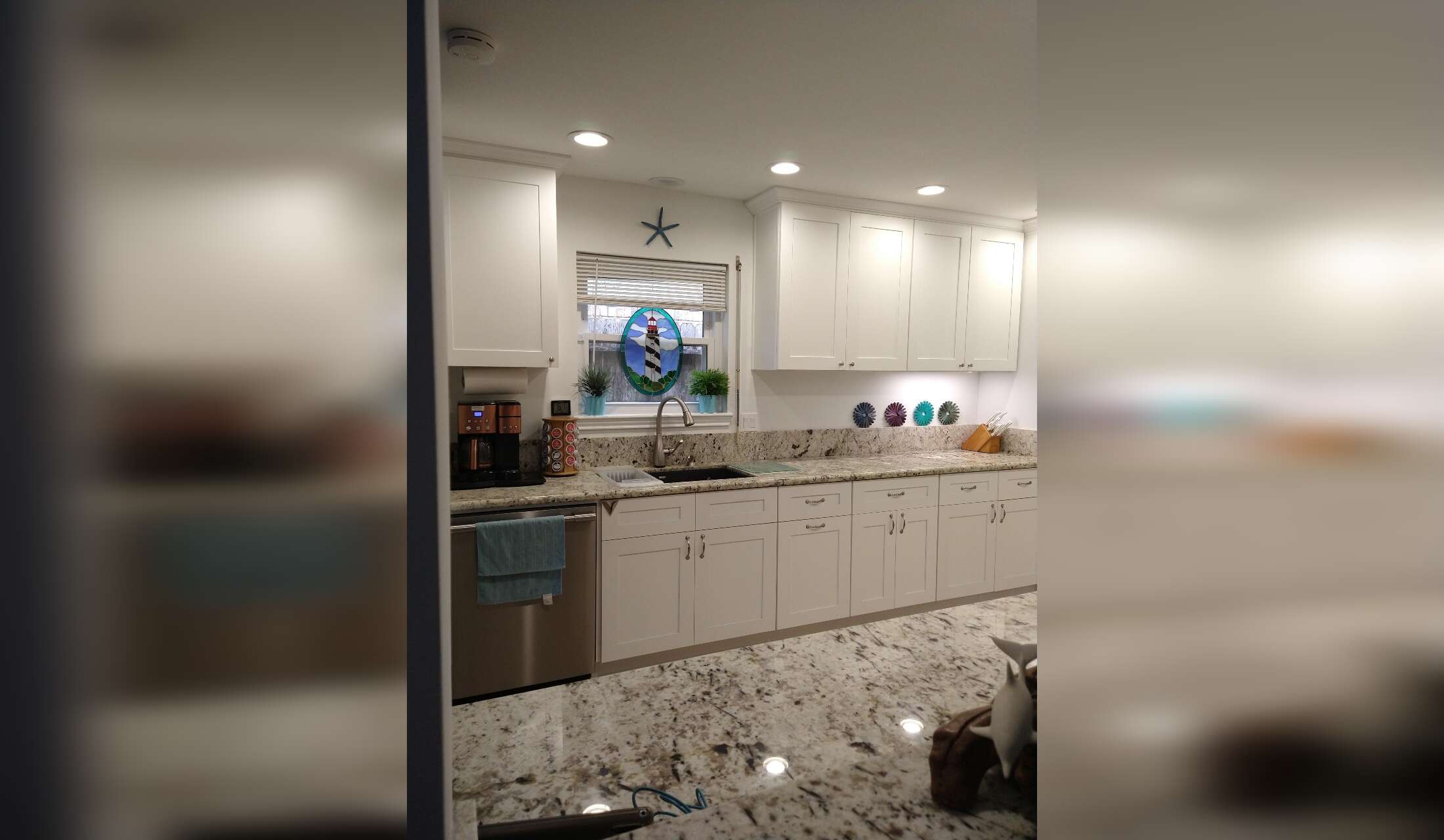 The kitchen has a dishwasher, gas stove with a convection oven, refrigerator, convection microwave, coffee station w/ Keurig coffee maker, complimentary variety of coffee, blender, cooking basics, dishware + flatware, garbage disposal, ice maker and Ninja air fryer.