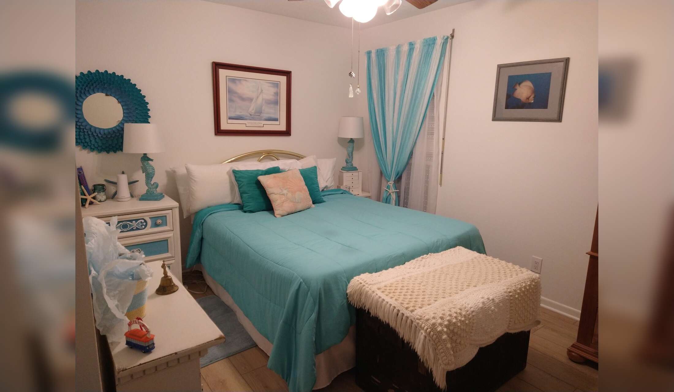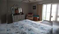 The master bedroom has an en suite bathroom with a large walk-in shower. The master has a king size bed. There is an additional full bathroom in the hallway for your guests. Second bedroom has a queen size bed.