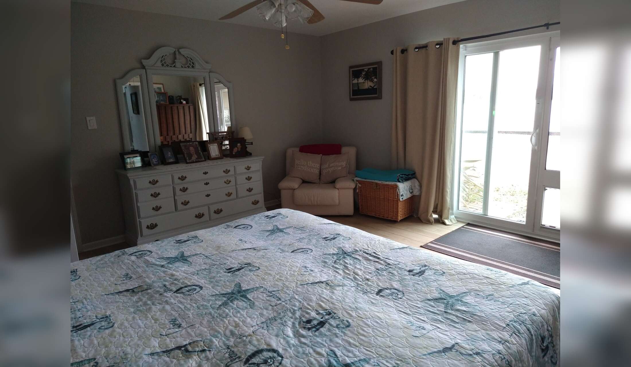 For your furry friends there is a medium doggie dog in the master bedroom sliding glass door that opens to a fenced in back yard. The dog door can be locked for security.