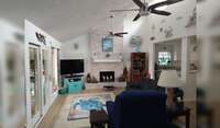 The living room has a gas fireplace. Ceiling fans are in most of the rooms.